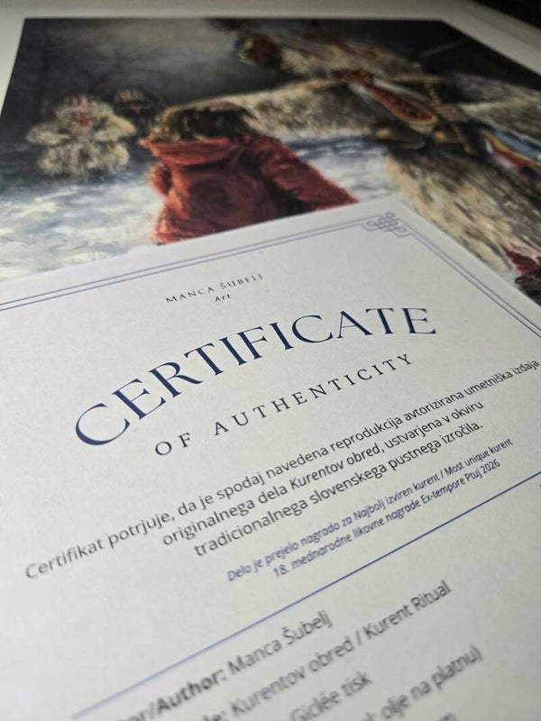 OPIS: Reprodukcija je natisnjena na arhivski, brezkislinski umetniški papir Hahnemühle Photo Matt Fibre (200 g/m²), znan po svoji izjemni kakovosti in prefinjeni mat površini. Celulozni papir nežno združuje naraven otip z visoko barvno ločljivostjo, kar omogoča izjemno podobo in mehko reprodukcijo originalnega dela.