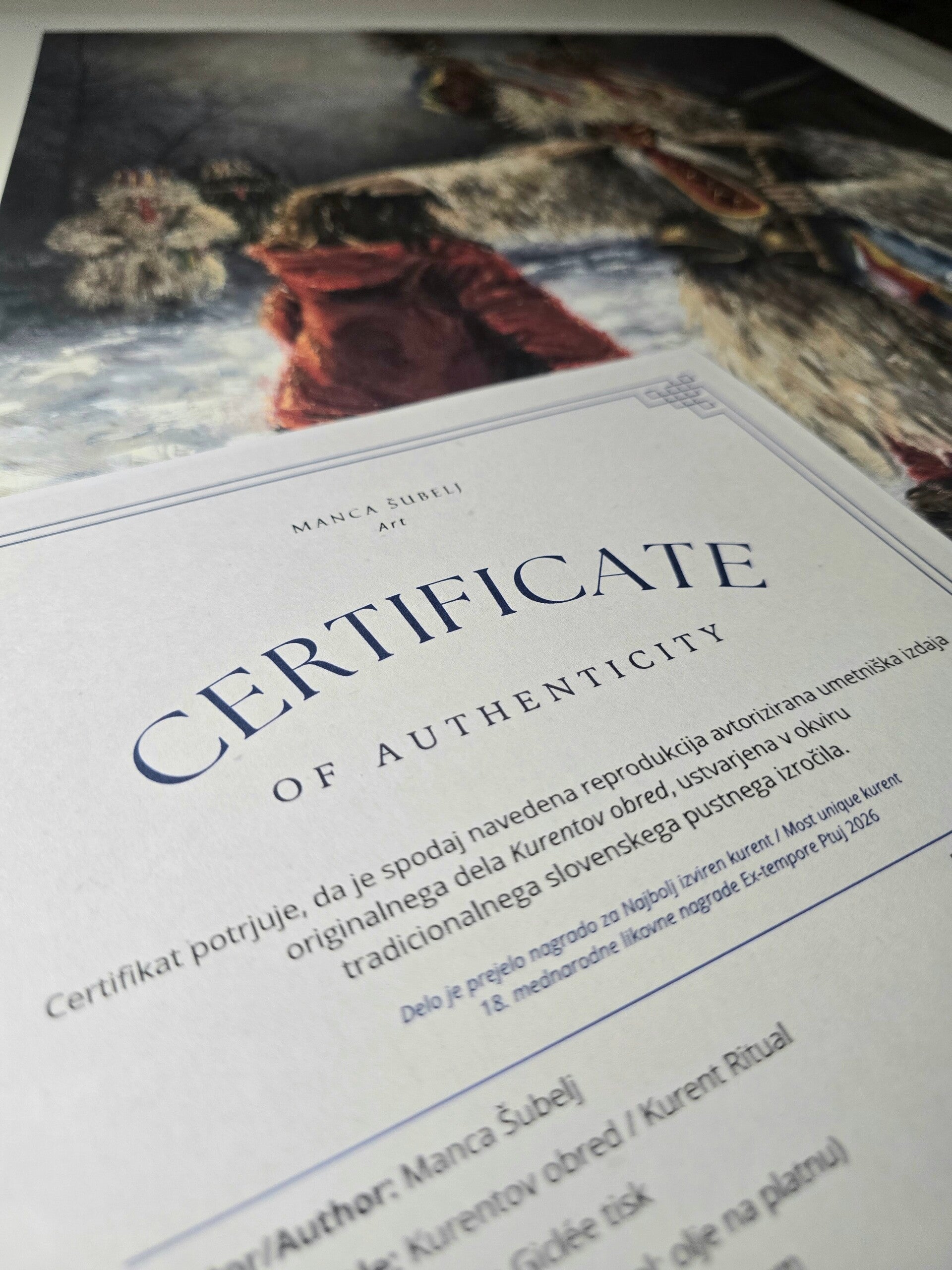 Reprodukcija vključuje; Certifikat avtentičnosti, oštevilčenje, suhi žig, podpis